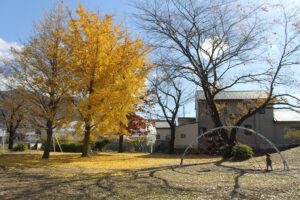 11月中旬頃になると、公園内に植えられたイチョウの木が黄色く色づきます。大きなイチョウの木が秋色に染まる様子は感動そのもの。落ちた葉っぱを沢山集めて子ども達も楽しそうに遊んでいました。