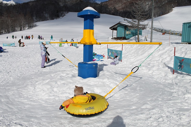 こちらの浮き輪のようなピカチュウのチューブ(スノーチュービング)に腰かけてゲレンデの斜面を滑り降ります。結構なスピードが出るので、スリルがあるけどクセになる面白さ!コースが上手く作られているので、最後はしっかり減速してくれるので安心です。3歳の息子も気に入って何度も滑りに行きました。